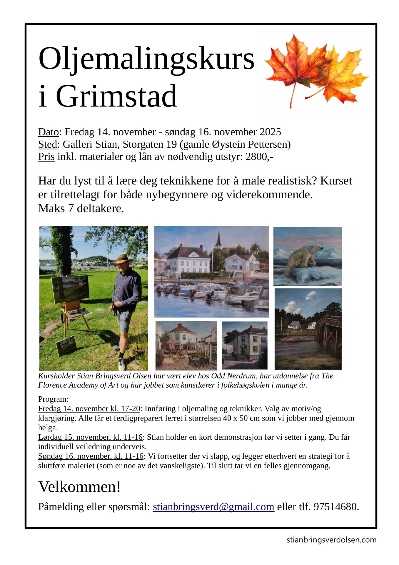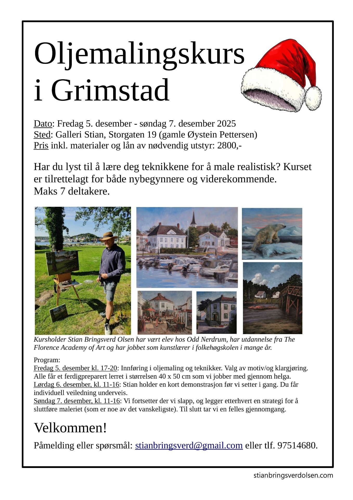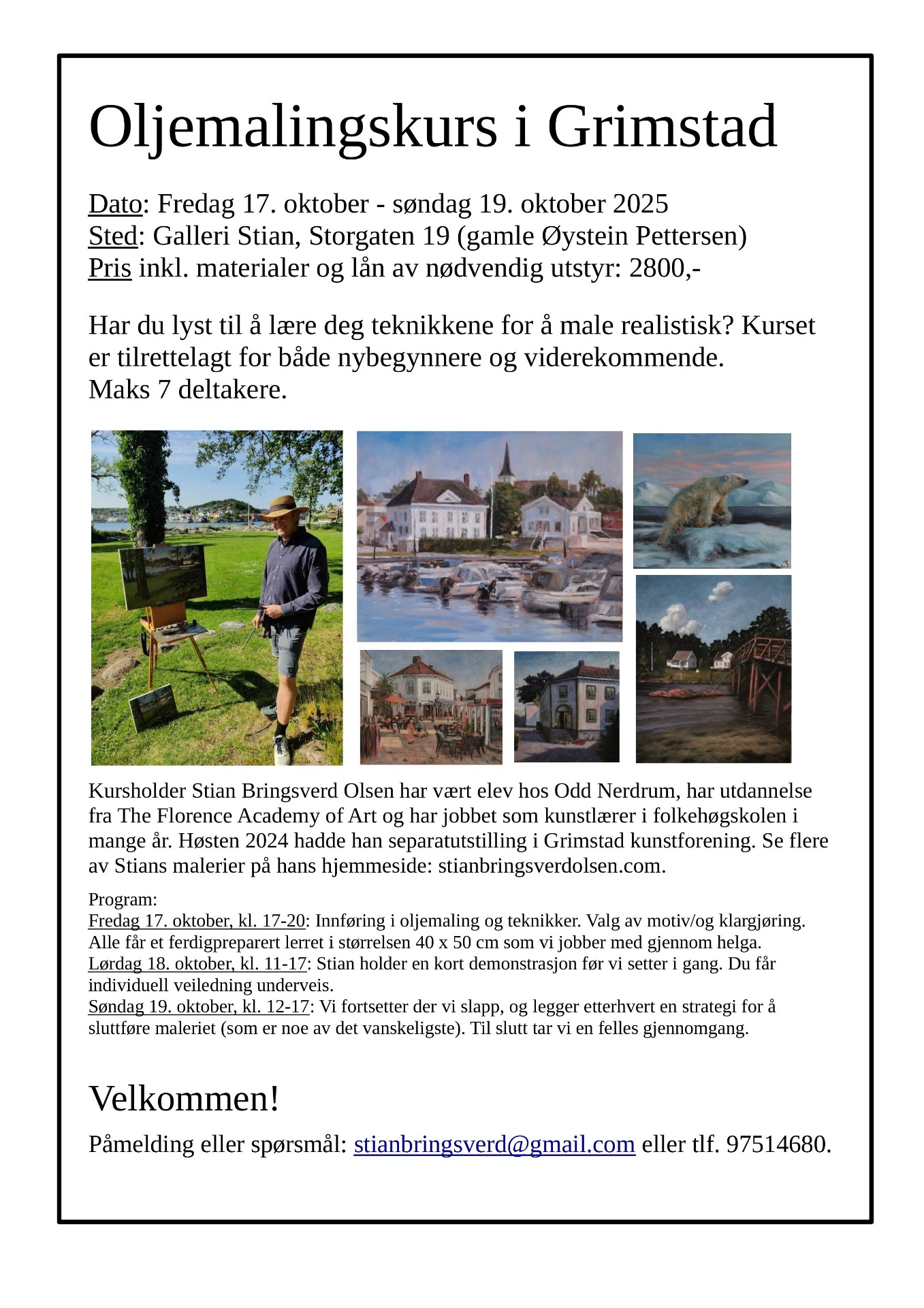 Jeg holder nytt helgekurs i oljemaling 13.-15. juni. Som tidligere kurs vil dette være introduksjonskurs i realistisk oljemaling. Kurset passer for både nybegynnere og viderekommende. Hver deltaker bruker helgen på å male hvert sitt bilde. Prisen for malekurset er 2.800,-. Du får låne alt av nødvendig materiell. Kurset holdes i mitt atelier (Galleri Stian) i Grimstad sentrum i Storgata 19 (gamle Øystein Pettersen).